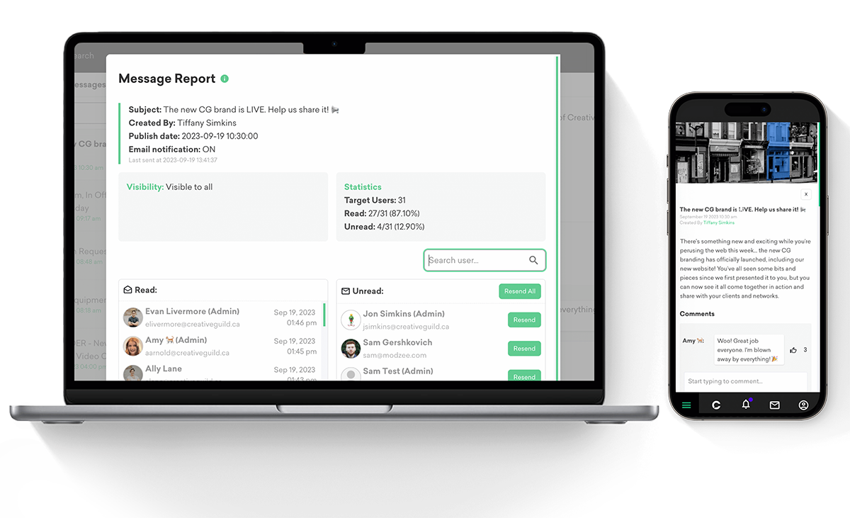 Send memos directly to various teams on their homepage and directly to their email. See if your employees read your message or downloaded attachments with message analytics.