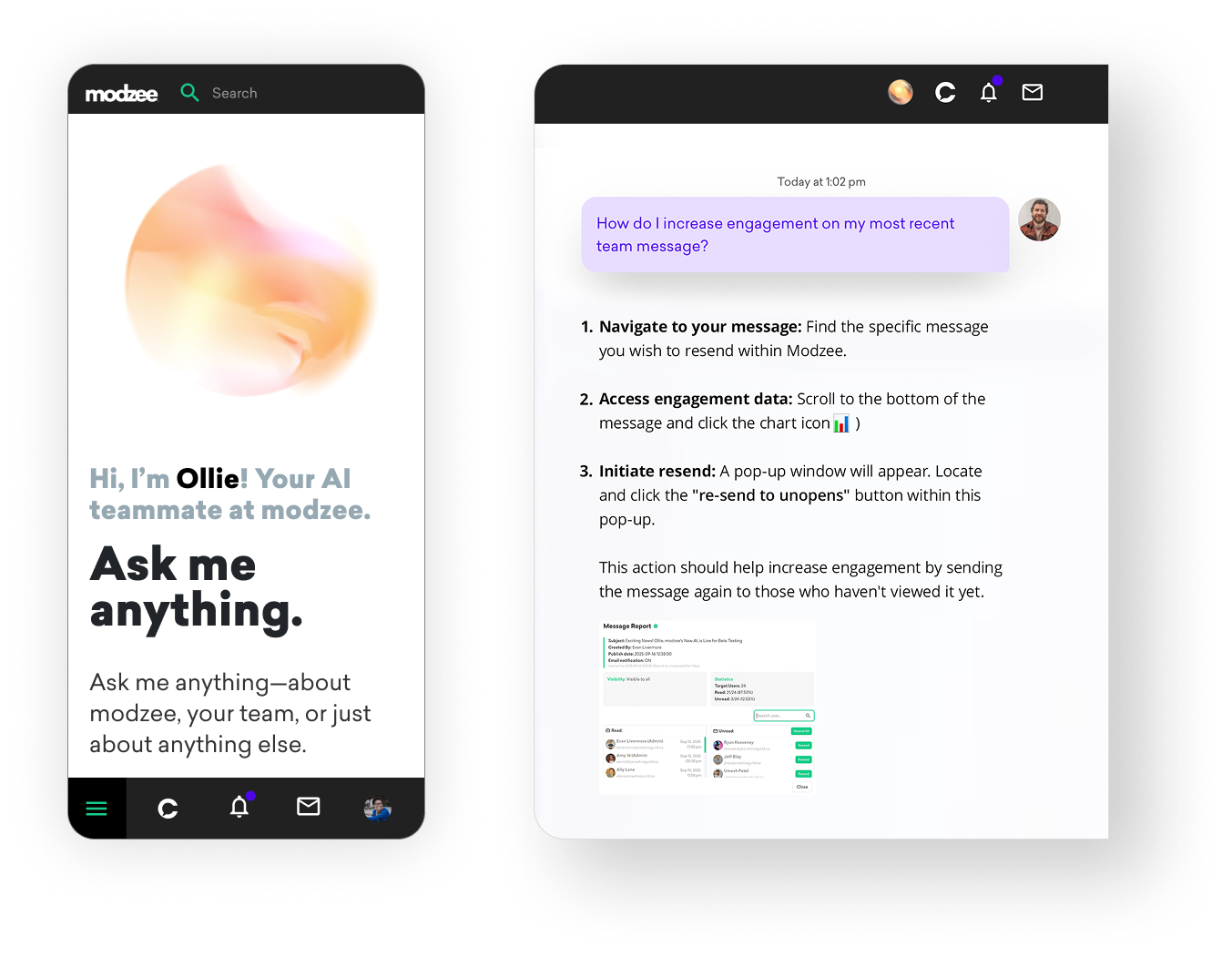 Work faster. Find answers instantly. Get more out of every click. We built Ollie to make modzee even easier to use—and way more powerful. From content search to platform guidance to day-to-day tasks, Ollie is your new go-to teammate.