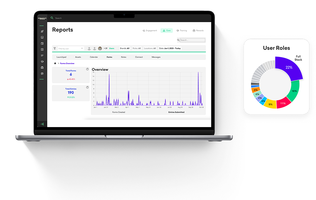 Use our custom form builder to create and distribute polls or surveys to your brands, groups, roles and locations.